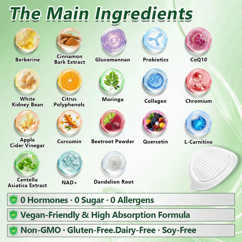 O vinagre de maçã em pó, o extrato de feijão branco e o extrato de canela atuam em sinergia no metabolismo de carboidratos e na motilidade intestinal, reduzindo a atividade das enzimas digestivas e auxiliando na desintoxicação hepática e biliar e no fluxo da bile — promovendo a digestão de gorduras, a absorção de nutrientes e a eliminação de endotoxinas para manter um ambiente intestinal mais equilibrado. A moringa, o extrato de chá verde e o extrato de semente de coentro, ricos em polifenóis naturais, ajudam a inibir bactérias patogênicas, favorecem a expansão de probióticos benéficos e aumentam a diversidade da microbiota intestinal, melhorando o inchaço, a irregularidade intestinal e o desconforto digestivo em geral.